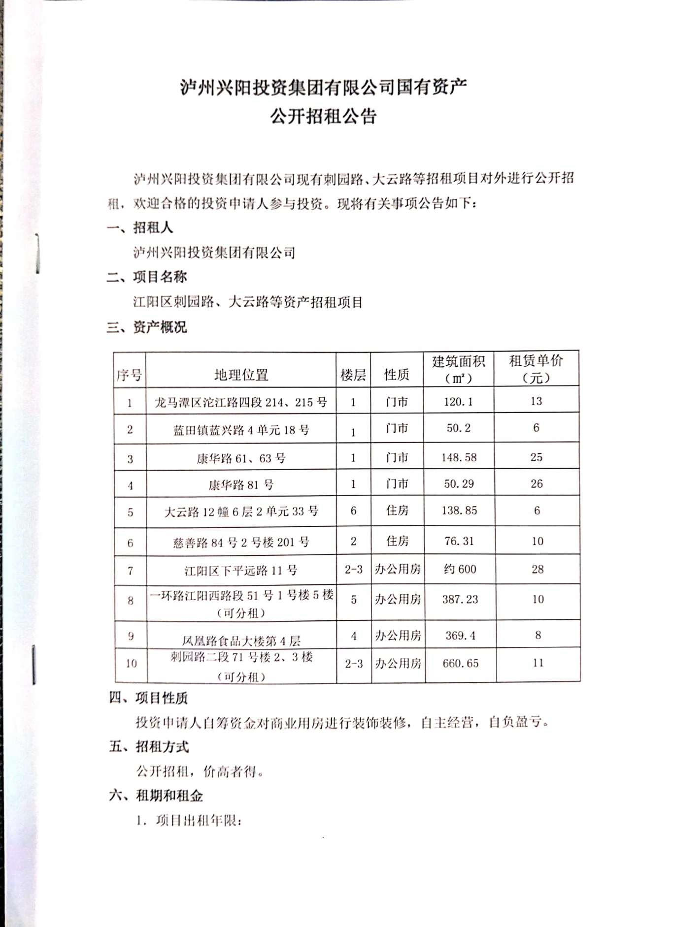 泸州兴阳投资集团有限公司国有资产公开招租公告