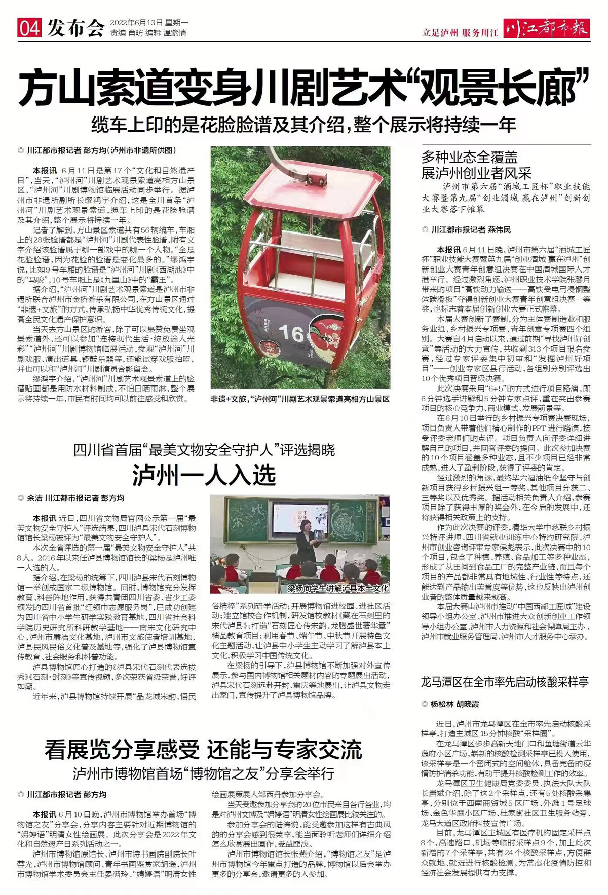 近日,由市文化广播电视和旅游局主办,市非遗所和泸州市金桥游乐有限公司联合承办的“连接现代生活·绽放迷人光彩”泸州河川剧博物馆临展活动在方山索道举行,一百余名游客参与了本次活动。