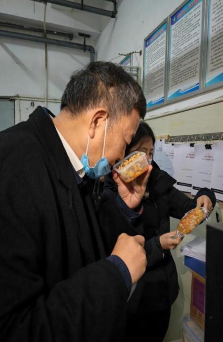 检查组一行先后查看了学校食堂的食材进出库、晨检记录、食品留样等情况,并对食品留样、后厨卫生、就餐环境等方面提出了具体要求。